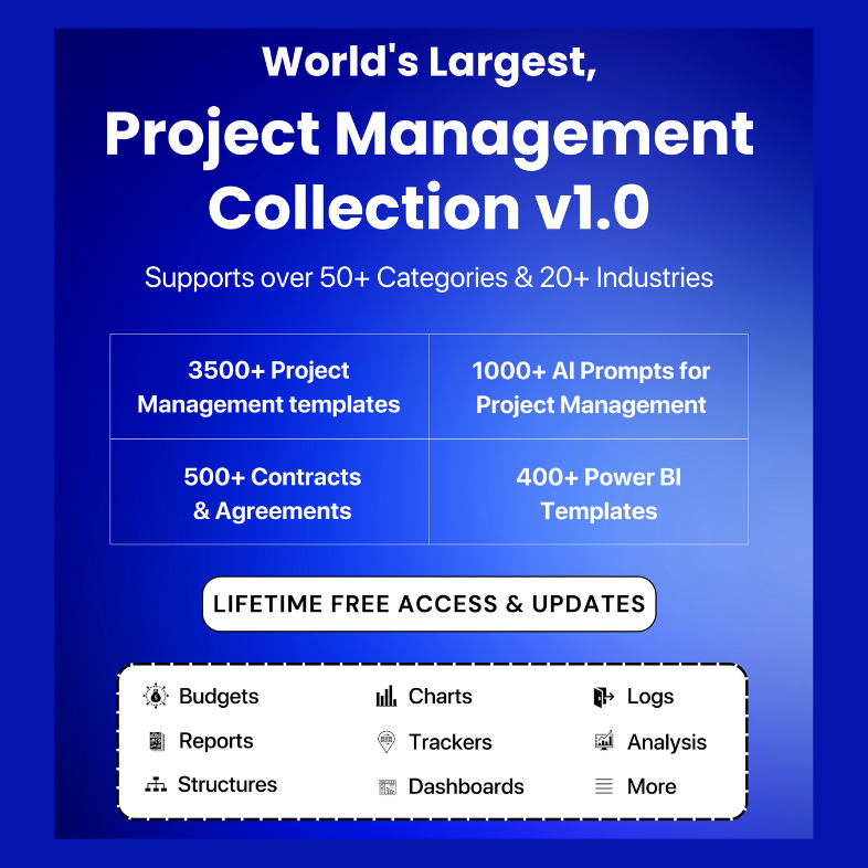 Introducing the **World’s Largest Project Management Collection v1.0**, a powerful all-in-one toolkit designed for professionals across 50+ categories and 20+ industries. This bundle includes over **3500+ project templates**, **1000+ AI prompts**, **500+ contracts & agreements**, and **400+ Power BI templates**. From budgets, reports, and trackers to dashboards, charts, and analysis tools—everything you need for seamless project execution is included. Get **lifetime free access and updates**, ensuring long-term value and continuous enhancements. Whether you're a manager, freelancer, or business owner, this collection will streamline your workflow and boost productivity like never before.