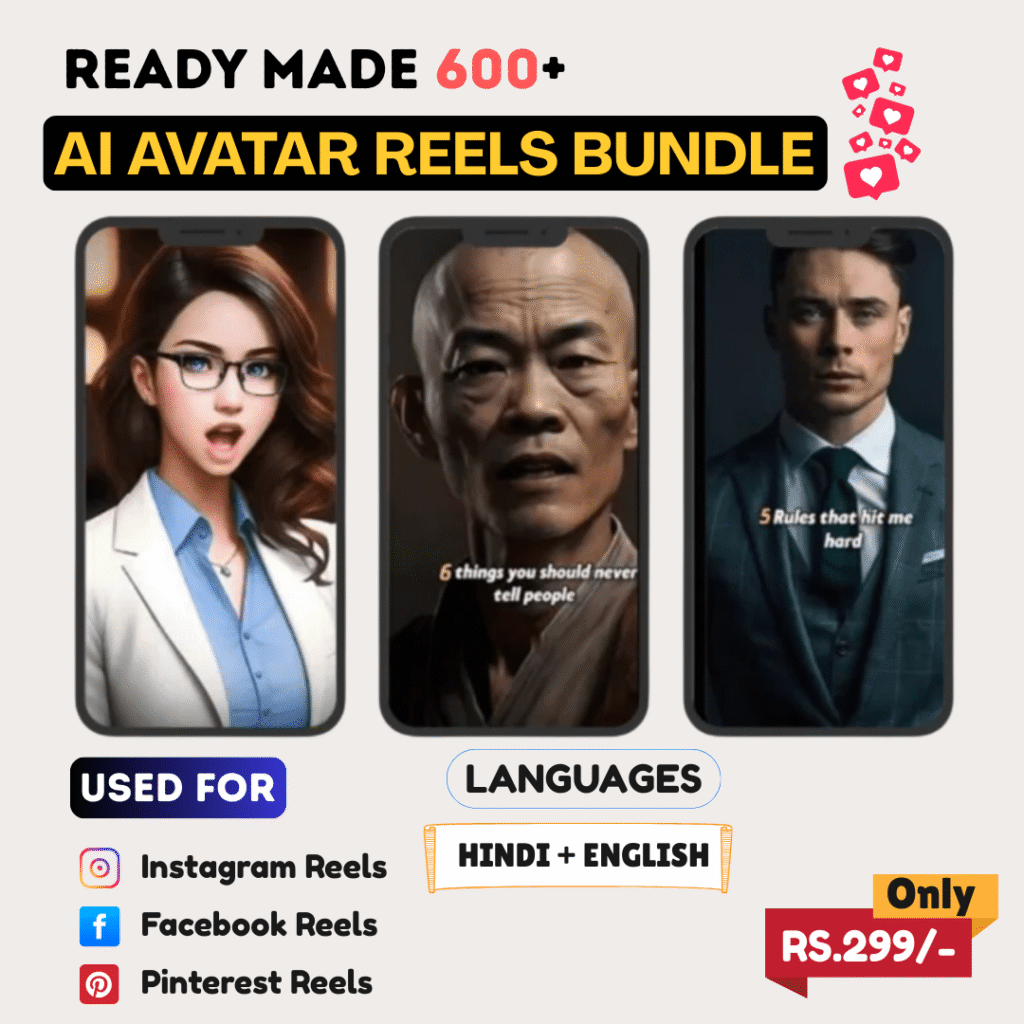 Unlock 600+ ready-made **AI Avatar Reels** designed to skyrocket your social media growth! This bundle includes high-quality reels in both **Hindi and English**, perfect for Instagram, Facebook, and Pinterest. Each video features eye-catching AI avatars with powerful, viral messages that grab attention and boost engagement. Whether you're a content creator, influencer, or digital marketer, this bundle saves you hours of editing while delivering professional results. Just download, post, and watch your audience grow. No technical skills required! Grab this amazing deal now for just **₹299** – limited-time offer for creators who want to stay ahead of the trend!